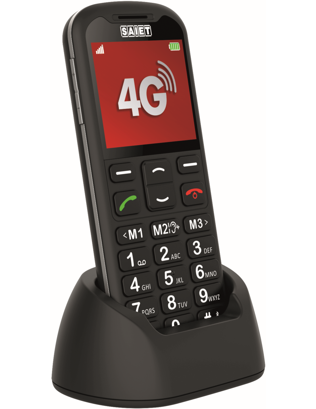 Cellulare 4G con tasti e caratteri grandi, Display 2.2" a colori, audio extra amplificato con tasto +25 dB, compatibile con apparecchi acustici, qualità audio 4G Volte, tasti parlanti, tasto SOS, 8 foto contatti, rubrica fino a 500 contatti, funzione lente di ingrandimento, fotocamera, Bluetooth,  torcia a LED con tasto dedicato, base di appoggio e ricarica.