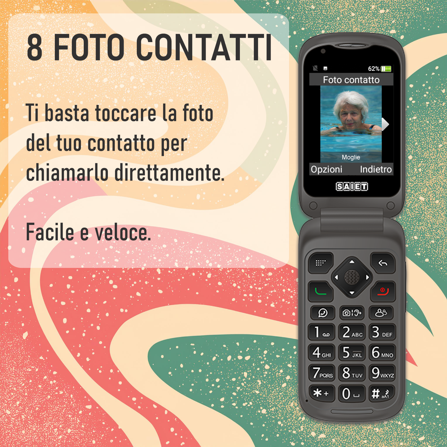 Inoltre, con il tasto dedicato a WhatsApp e la funzione di chiamata tramite le foto dei tuoi contatti, potrai parlare con chi vuoi con un solo tocco.