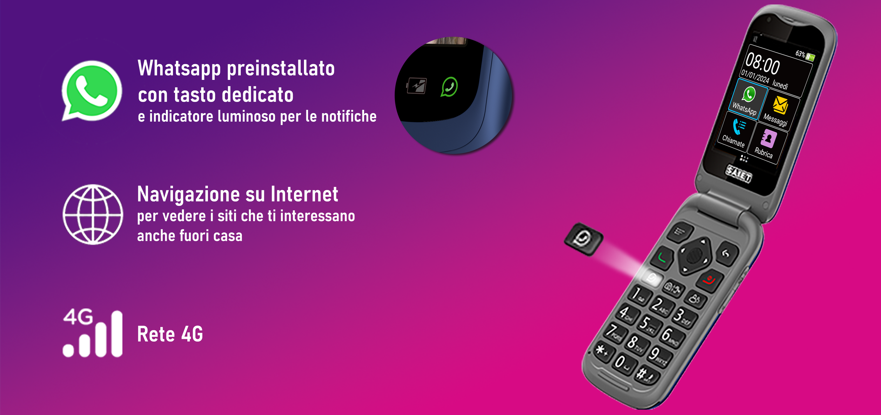 Con Link 4+ hai Whatsapp preinstallato, ti basta inserire i tuoi dati e sei già pronto per utilizzarlo. Quando il telefono è chiuso, l'icona luminosa ti segnala se qualcuno ti ha scritto e con il tasto dedicato puoi accedere direttamente all'app. Se vuoi consultare un sito web quando sei fuori casa, ti basta aprire il browser e scrivere quello che stai cercando direttamente dalla tastiera del telefono così è molto più facile evitare errori.
