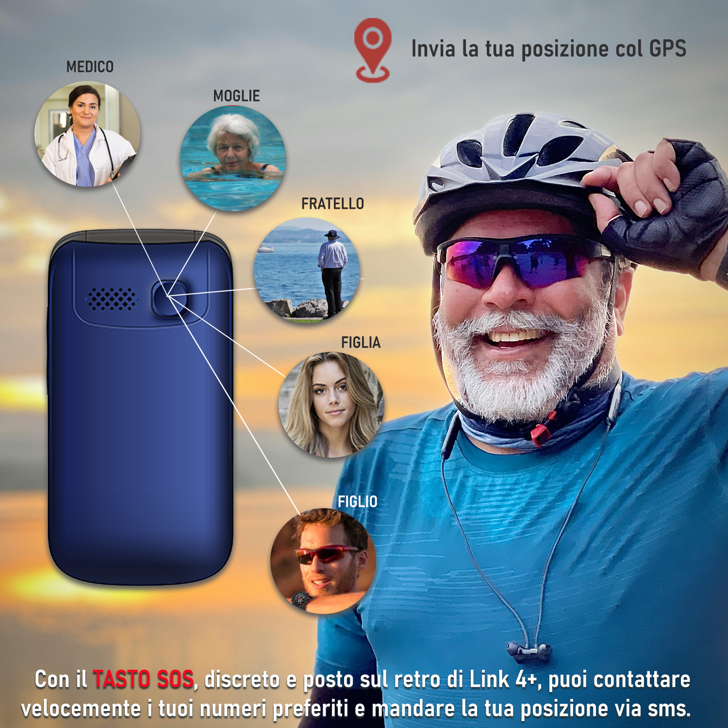 • Tasto SOS: chiama 5 numeri ed invia messaggio di aiuto con posizione GPS