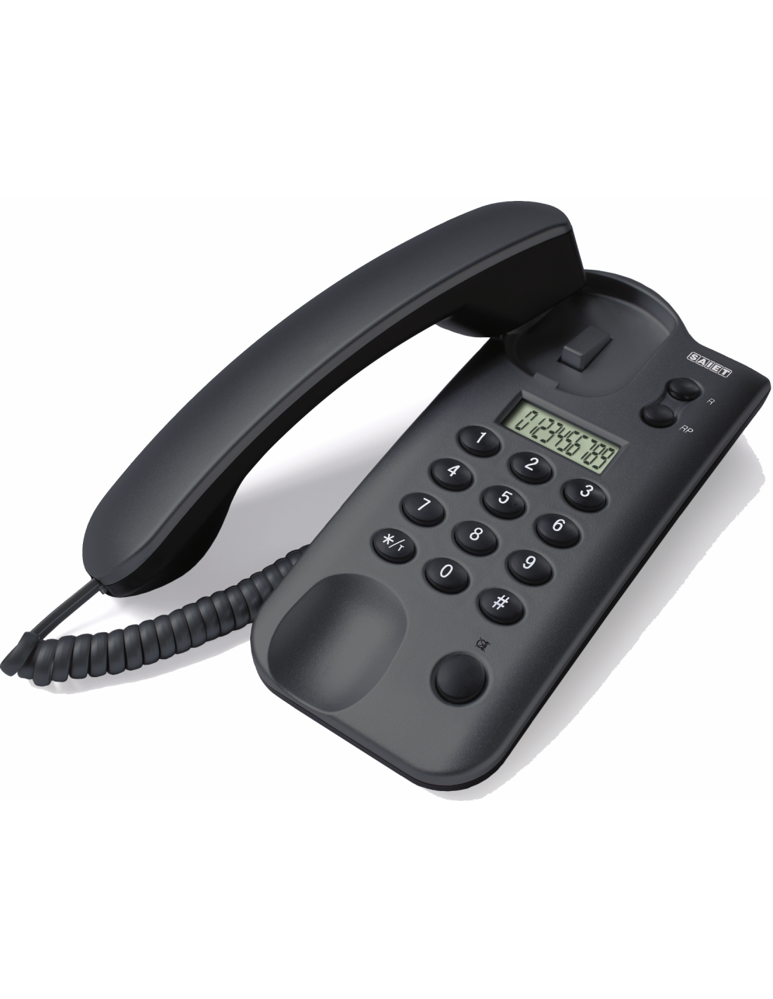 Telefono compatto con display LCD a 10 cifre e fissaggio a possibilità di fissaggio a parete.