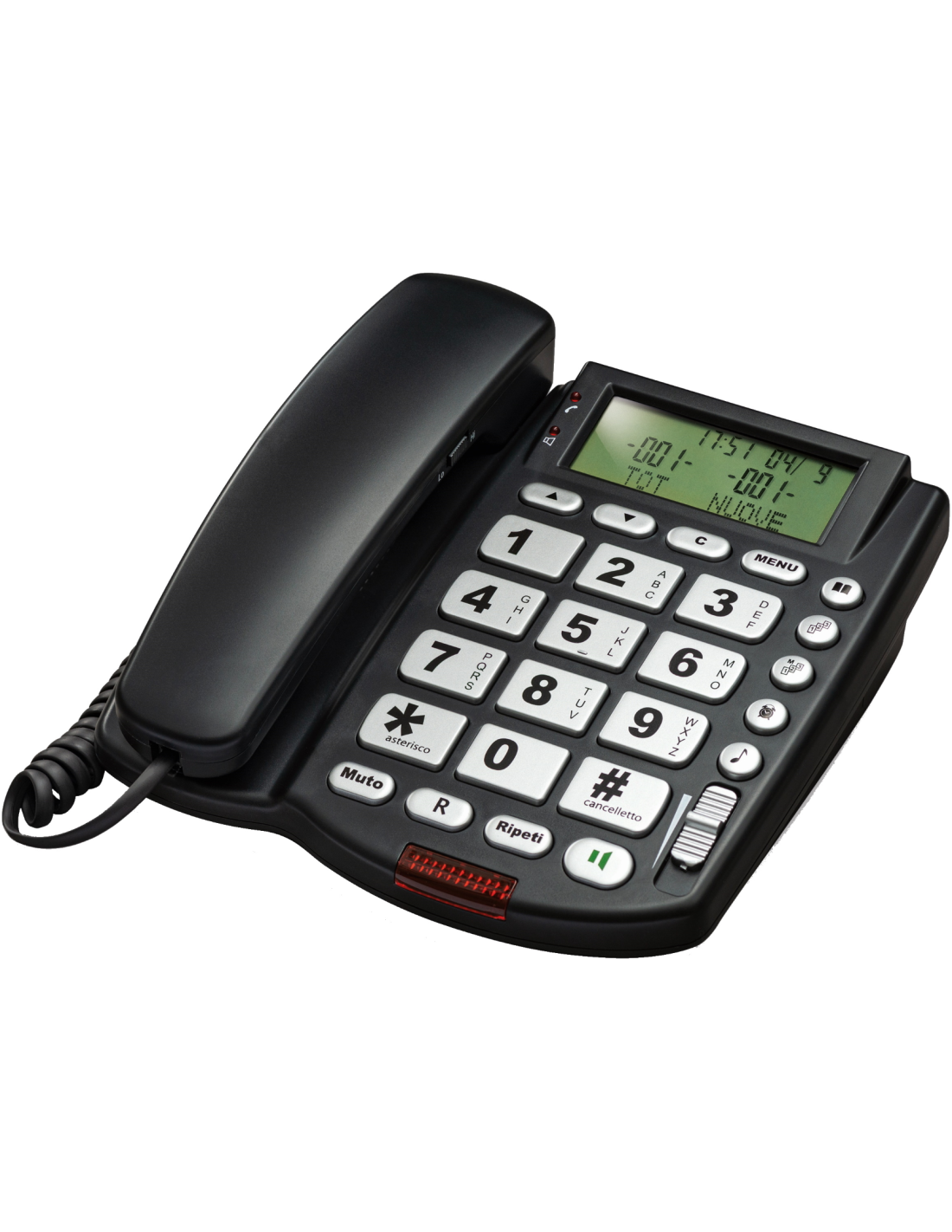 Telefono multifunzione a tasti grandi e ampio display su 3 righe, identificativo del chiamante (CID), volume Rx regolabile, volume suoneria a 3 livelli, 12 numeri programmabili per chiamate dirette (tramite due tasti), ampio indicatore luminoso di chiamata in arrivo, sveglia, vivavoce, installabile anche a parete, non necessita di batterie.